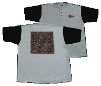 three-button collarless shirt. Ash colored with black sleeves,